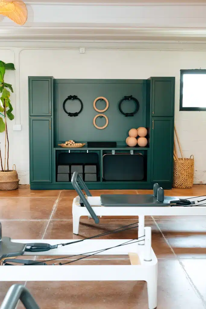 The studio features Balanced Body reformers, custom storage and prop displays, natural materials, and soft architectural lighting. Large windows and warm textures create a grounded, inviting environment distinct from traditional fitness spaces.